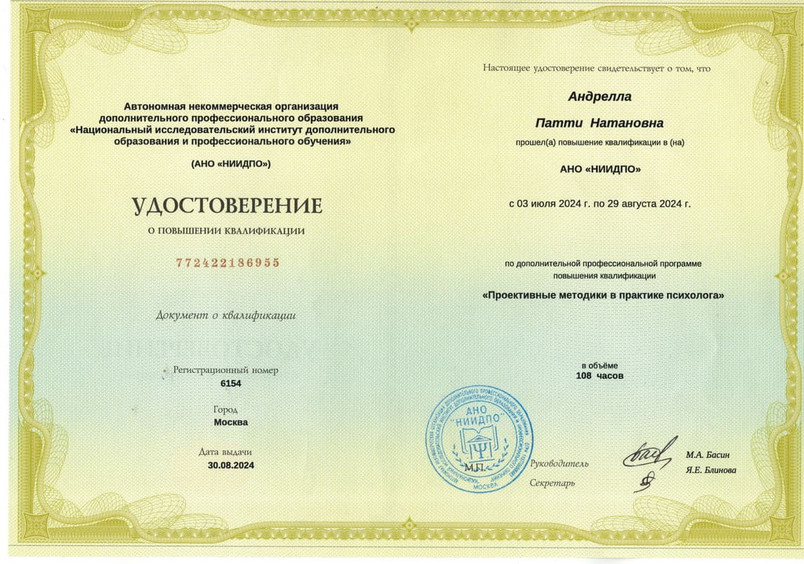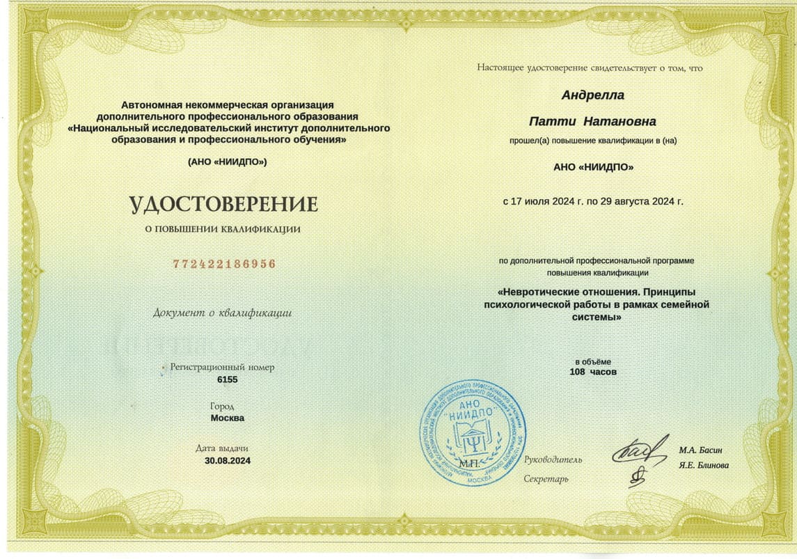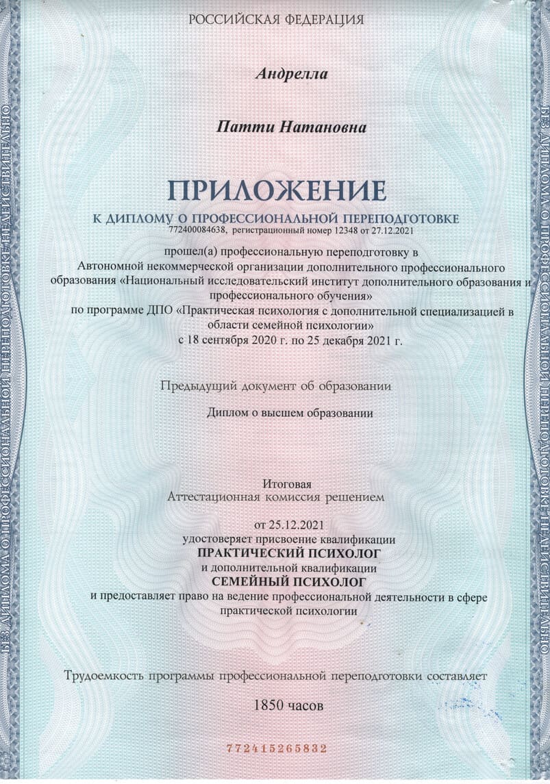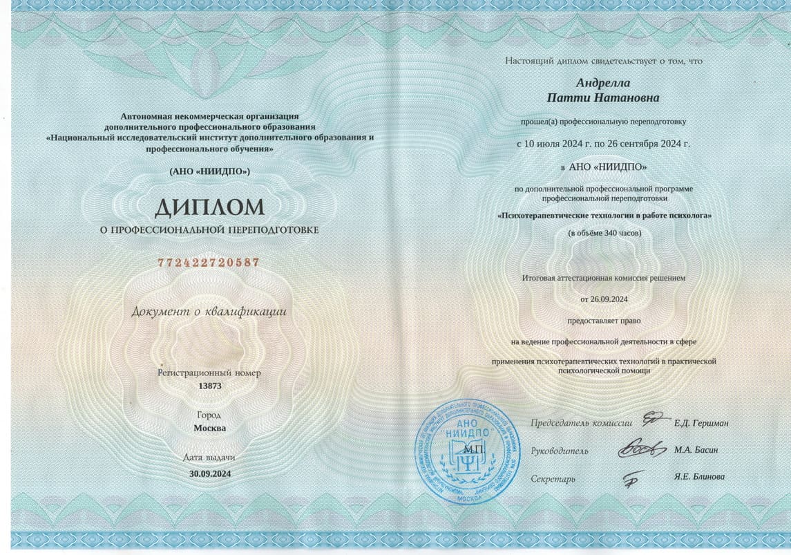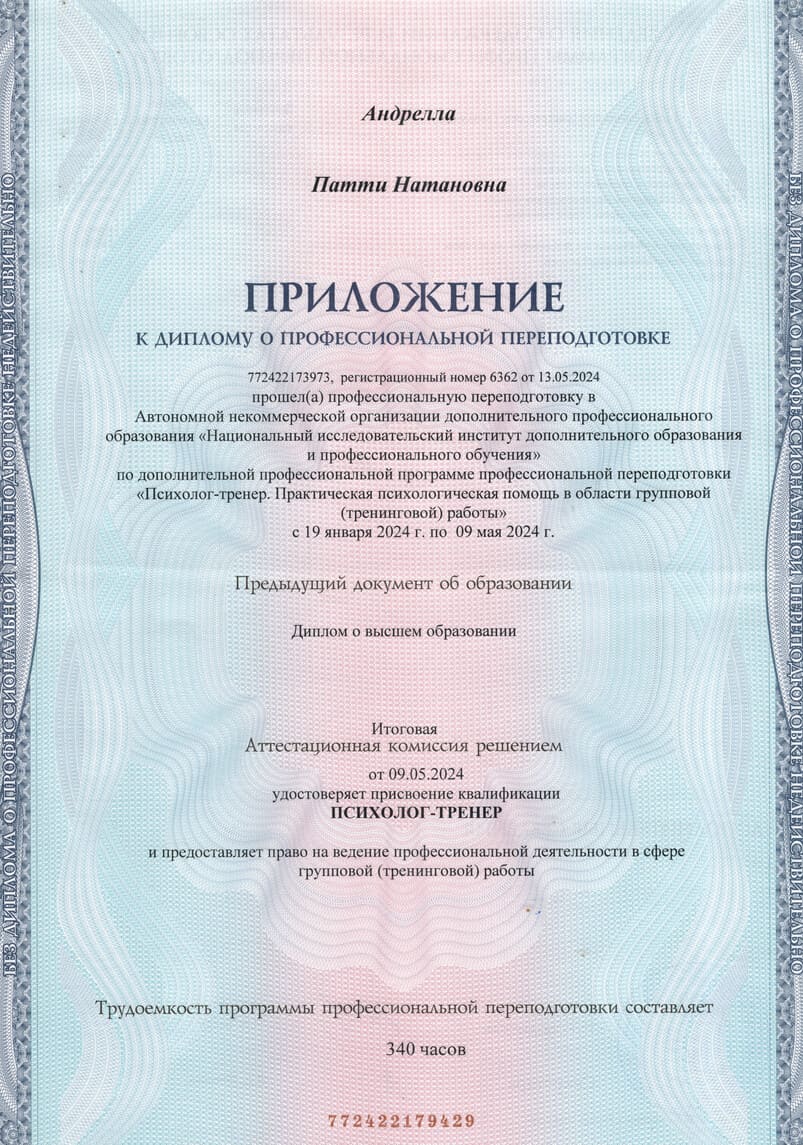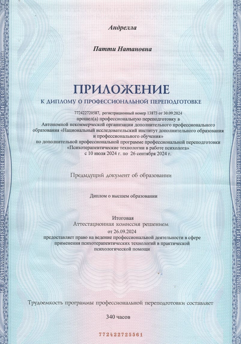 Патти — это человек, которому можно доверить всё: и самое сокровенное, хрупкое, беззащитное, и самое тяжёлое, неприятное, постыдное. Она уверенно чувствует себя в любой области ваших проблемных вопросов, умеет поддержать и помочь разобраться во всем дойдя до первопричины. Сессии проходят онлайн в удобных для вас сервисах связи. Доступна разная продолжительность занятий: 1, 1,5 или 2 часа, по вашему выбору. Есть возможность переноса или отмены. Патти с пониманием относится к форс-мажорам. Хорошо налажена система обратной связи через сервисы Google: у вас, помимо личного чата в мессенджере, есть документ в Google, где можно отслеживать динамику занятий, а также напоминания в Google-календаре. Оплата производится переводом на карту с предоставлением чека за услугу.